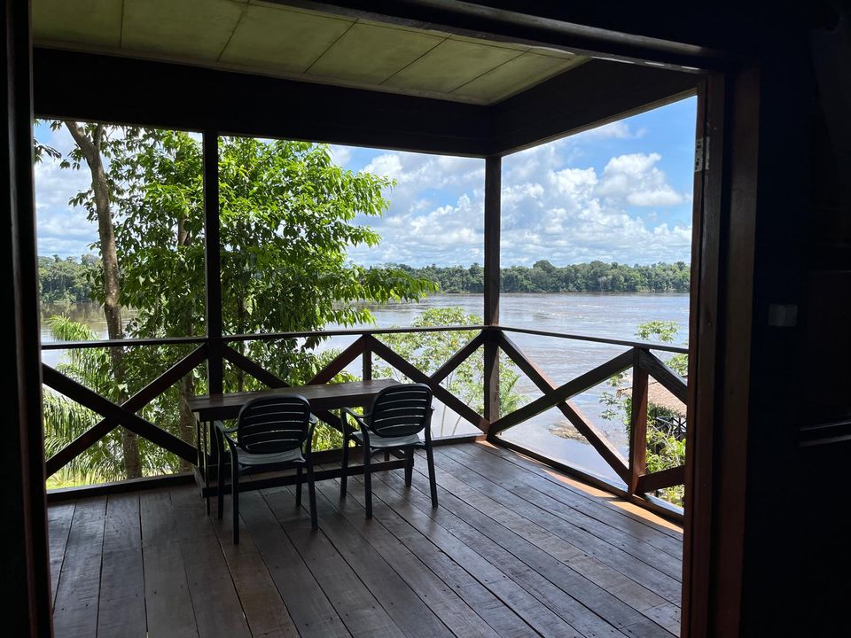 Het voelt bijzonder om na een kleine twee uur vliegen ineens midden in het regenwoud te staan. Het uitzicht vanaf de lodge is indrukwekkend: jungle zover je kijkt, met de brede rivier die rustig langs stroomt. Hier geen asfaltwegen of straatverlichting – alleen jungle, stilte en af en toe het geschreeuw van een ara’s op de achtergrond.